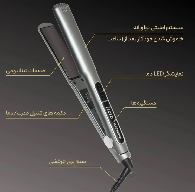 دارای سیم چرخشی 360 درجه ضد گره و طول 2 متر مناسب سالن - صافی 100% با ماندگاری بالای یک سال برای کراتین - دارای دمای 150 – 250 و480 – 300 فارنهاینت - دارای صفحات تیتانیوم با لایه تورملین - دارای دکمه ی خاموش و روشن - ویژگی های منحصر به فرد مناسب انواع مو - دارای نمایشگر دیجیتال - دارای قابلیت تنظیم دما